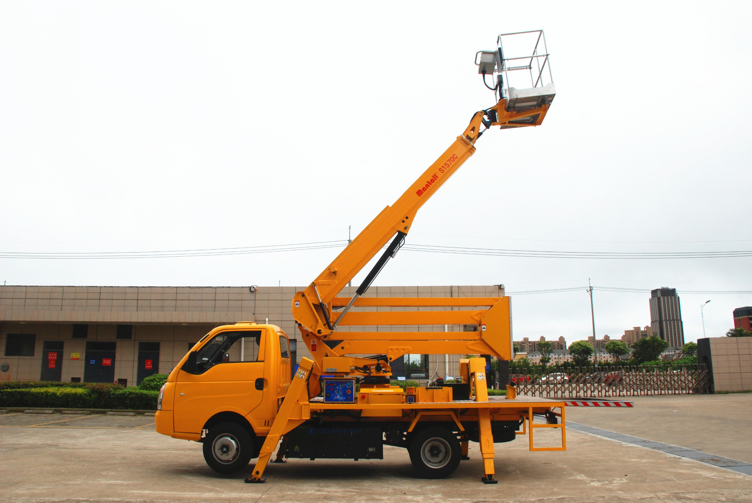 美通S系列车载型高空作业车的转台可360度旋转,举升臂最大可延伸14.5米, 平台可旋转180度,让工作位置定位精准,轻松跨越障碍物。